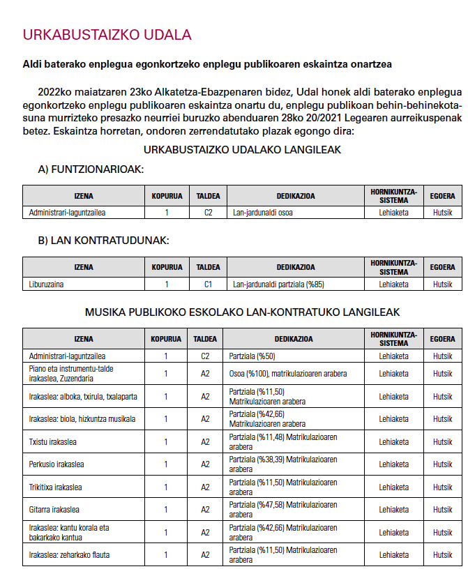 Aprobada la oferta de empleo público para la estabilización del empleo temporal en el Ayuntamiento 2022-05-30T18:20:59+00:0030/05/2022| Ver imagen más grande A fecha de 23 de mayo de 2022, el Ayuntamiento de Urkabustaiz ha aprobado la oferta de empleo público para la estabilización de empleo temporal correspondiente a las plazas que se reseñan en la tabla. ¡Compártelo! FacebookTwitterRedditLinkedInWhatsAppTumblrPinterestVkCorreo electrónico