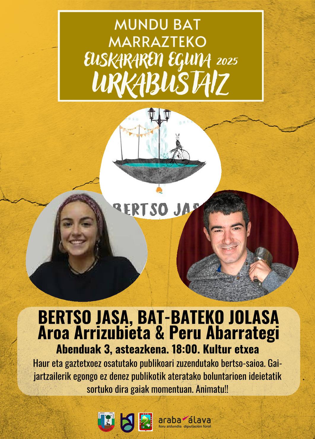 Abenduaren 3an, Euskararen Nazioarteko Egunean, ume eta gaztetxoek BERTSO JASA, BAT-BATEKO JOLASA ikuskizunaz gozatzeko aukera izango dute, 18:00etan kultur etxean. Aroa Arrizubieta eta Peru Abarrategi bertsolariak ariko dira bertan, eta gai-jartzaile lanetan jarriko dituzte ikus-entzuleak. Bertsoekin jolasteko aukera paregabea, beraz!