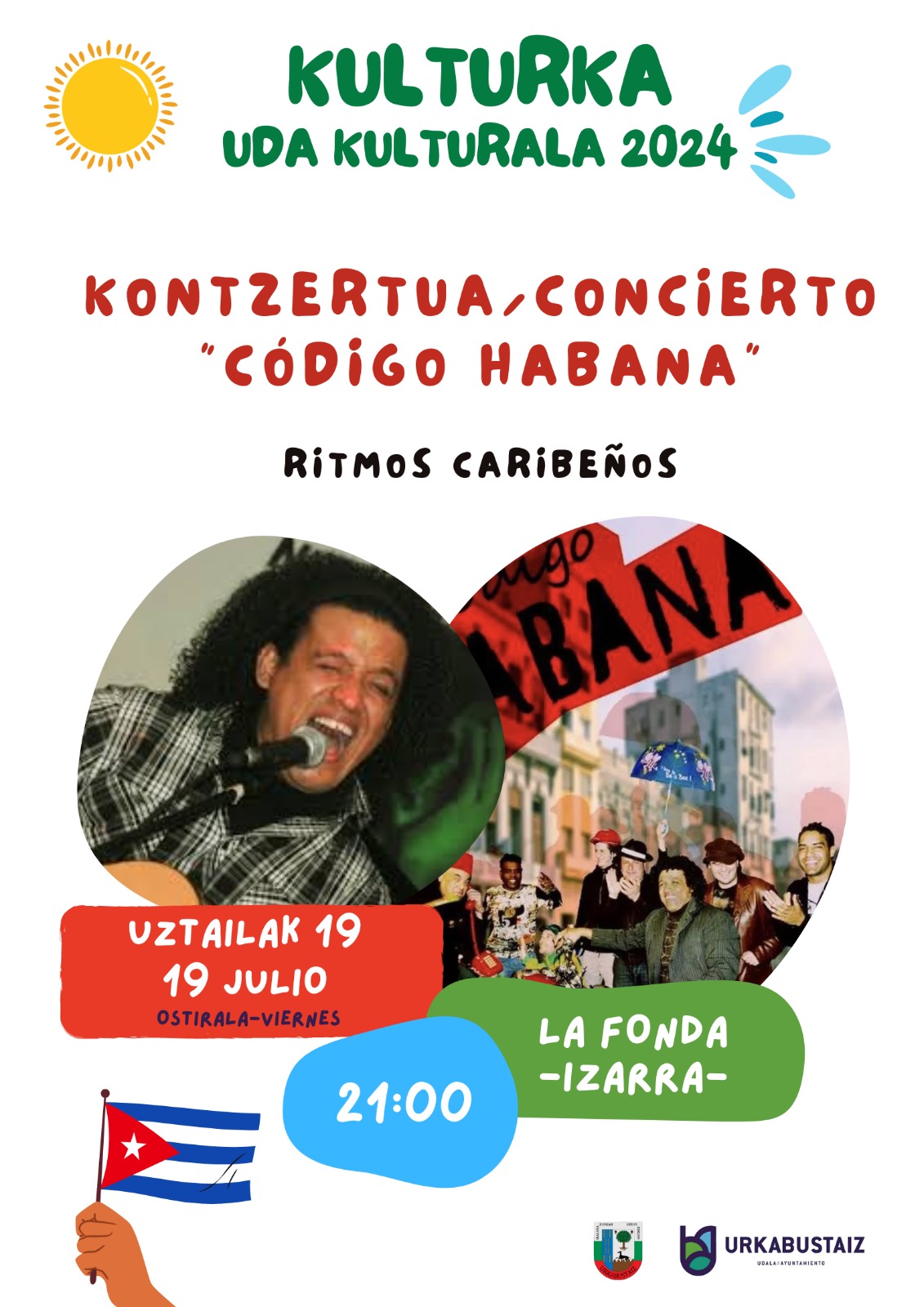 Hoy, viernes, concierto caribeño en la Fonda 2024-07-19T11:46:24+00:0019/07/2024| Ver imagen más grande Hoy, 19 de julio, la banda Código Habana ofrecerá un concierto de ritmos caribeños en La Fonda, a las 21:00. El concierto se enmarca dentro del programa Kulturka. ¡Compártelo! FacebookTwitterRedditLinkedInWhatsAppTumblrPinterestVkCorreo electrónico