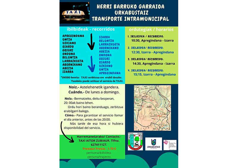 Con este servicio quedan cubiertos los intervalos horarios en los que no se ofrecía el transporte comarcal de la Diputación Foral de Alava. El objetivo es que las personas que lo necesiten puedan acercarse, entre otros lugares, a los centros de salud, facilitar la compra en el comercio local, y a aquellas ubicaciones en las que se realicen actividades de incidencia social y/o cultural promovidas por el Ayuntamiento de Urkabustaiz.