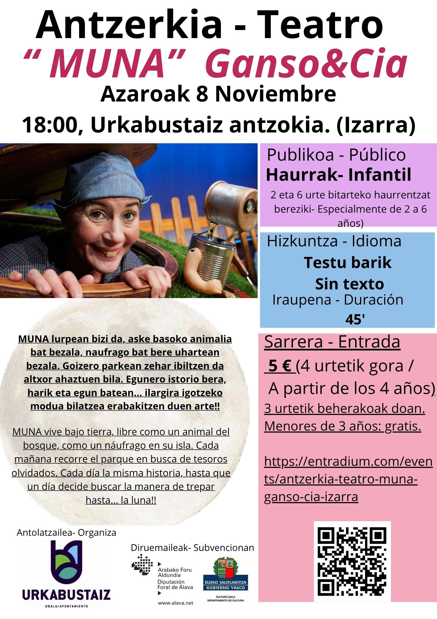 El 8 de noviembre, sábado, la compañía Ganso&Cía representará la obra ‘Muna’ en el Antzokia a las 18:00. Esta obra está dirigida a público de entre 2 y 6 años. No cuenta con texto y los menores de 3 años tendrán la entrada gratis.