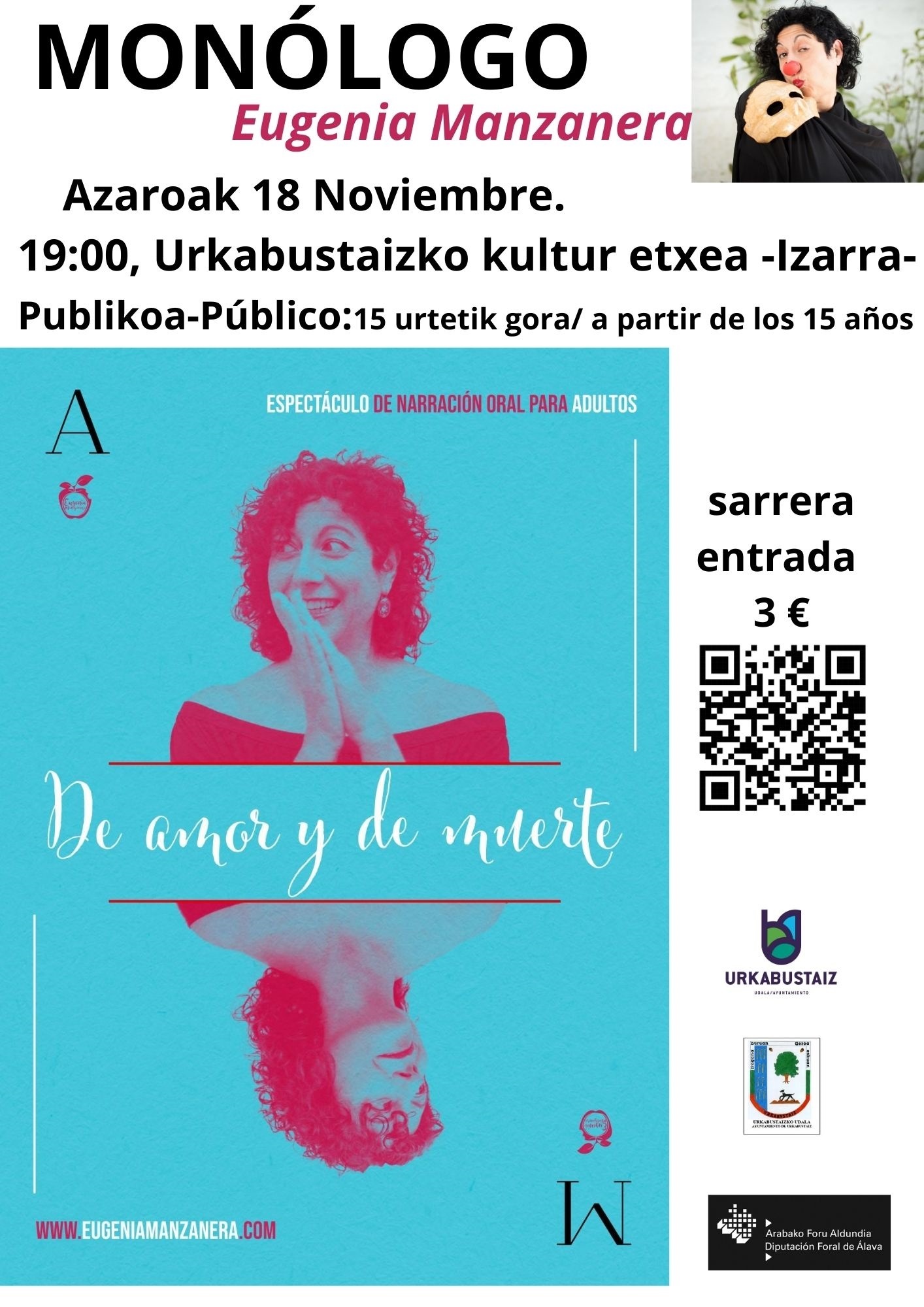Posteriormente, por la tarde, Manzanera cambiará completamente de tono y ofrecerá el espectáculo de monólogo ‘De amor y muerte’ dirigida al público mayor de 15 años. Tendrá lugar en la casa de cultura a las 19:00. La entrada será de 3 euros.